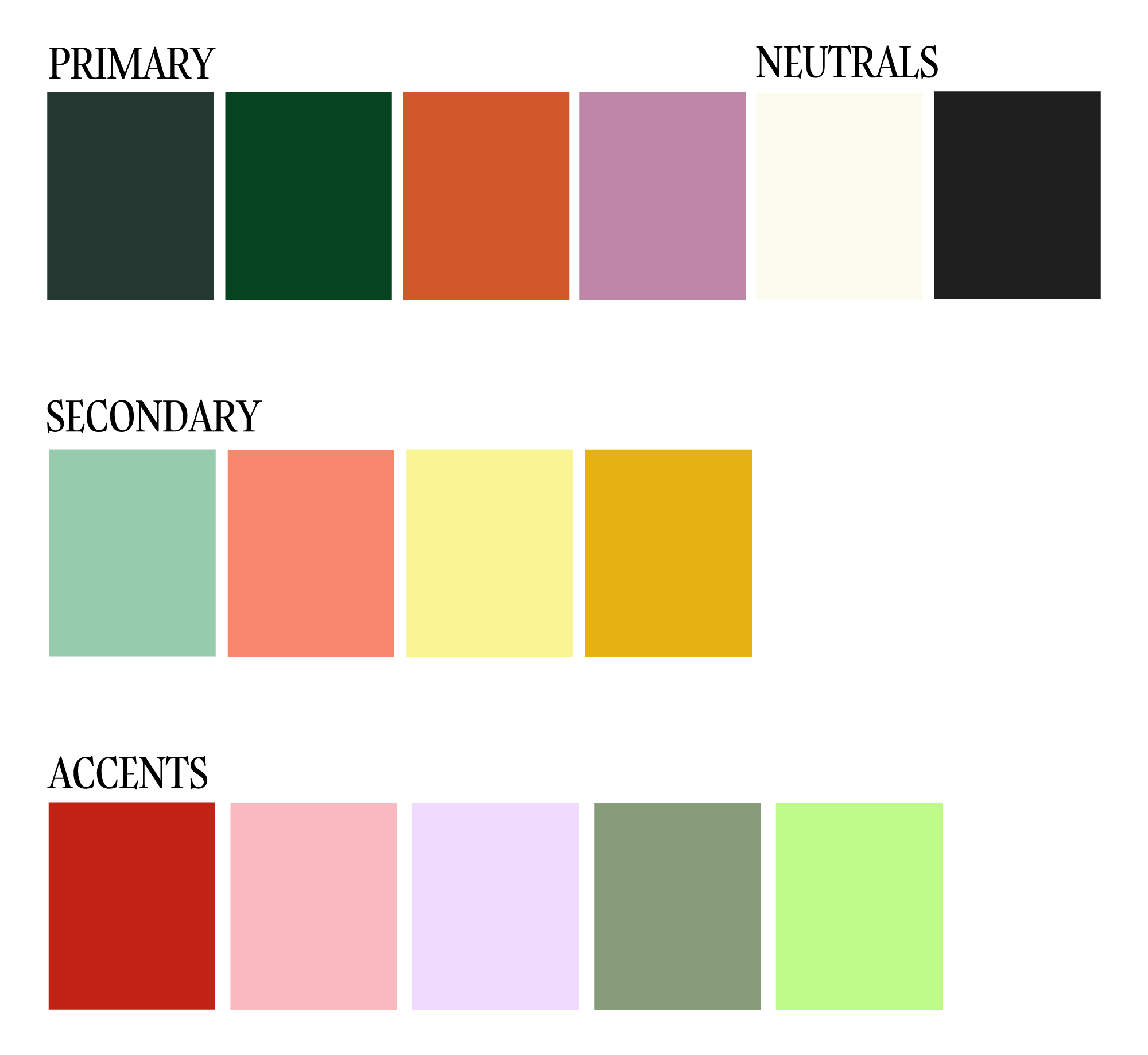This palette has a versatile range that lets us maintain cohesion while bringing variety. We’ll be able to use each category consistently across different materials, from digital content to print, with Primary colours setting the brand tone, Secondary colours adding balance and softness, and Accents for eye-catching details.